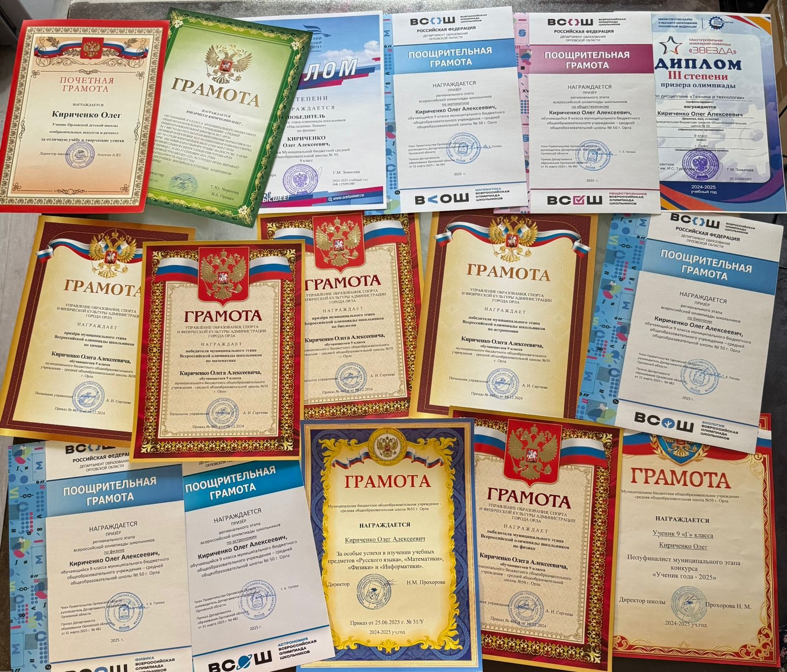 В орловской школе № 50 учится юноша, который уже сейчас демонстрирует впечатляющие академические достижения. Олег Кириченко – многократный призёр муниципальных этапов Всероссийской олимпиады школьников (ВсОШ) по математике, физике, географии, биологии, химии и обществознанию.